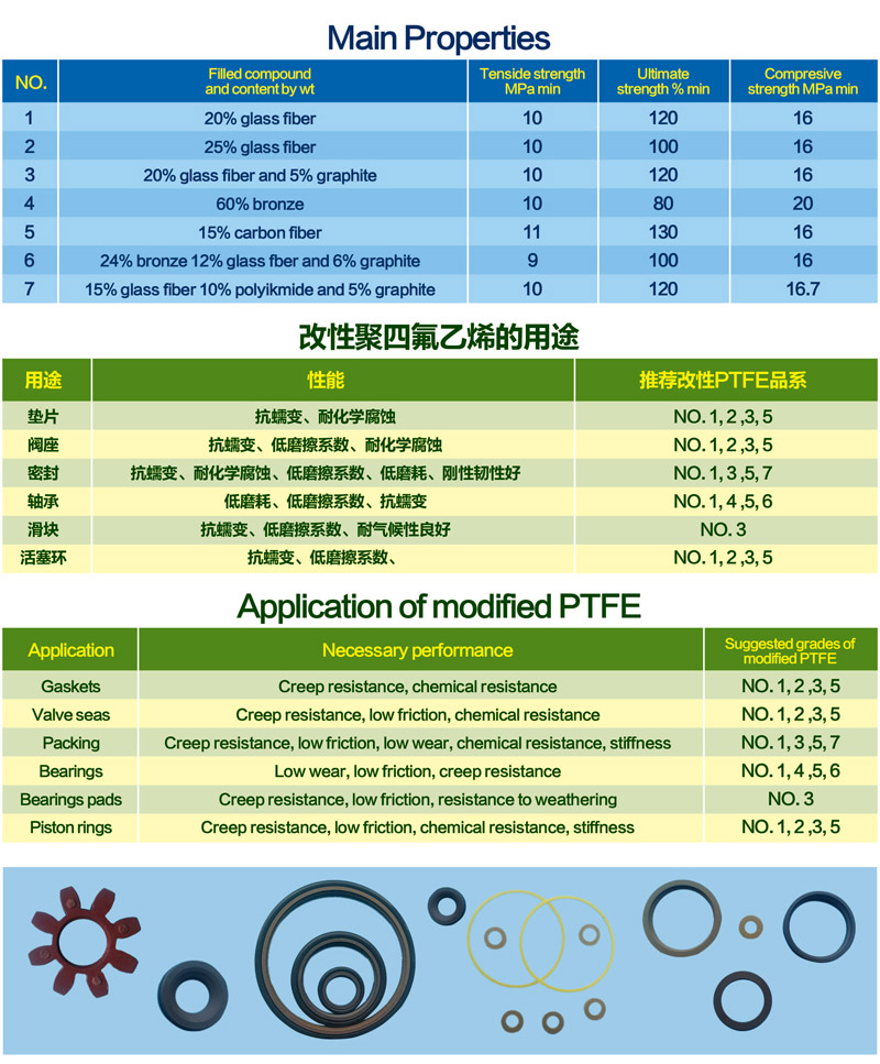 改性聚四氟乙烯制品選用填充聚四氟乙烯樹(shù)脂經(jīng)模壓、車(chē)削加工而成。懸浮聚合聚四氟乙烯樹(shù)脂與各種填充劑經(jīng)高速混合得到改性樹(shù)脂。適合與聚四氟乙烯混合的填充劑有高目數(shù)玻璃纖維、碳纖維、銅粉及潤(rùn)滑劑(石墨、二硫化鉬等),其已在生產(chǎn)中廣泛應(yīng)用。同傳統(tǒng)聚四氟乙烯相比具有更高的壓縮強(qiáng)度、耐磨性、導(dǎo)熱性和抗蠕變性等諸多優(yōu)點(diǎn)。